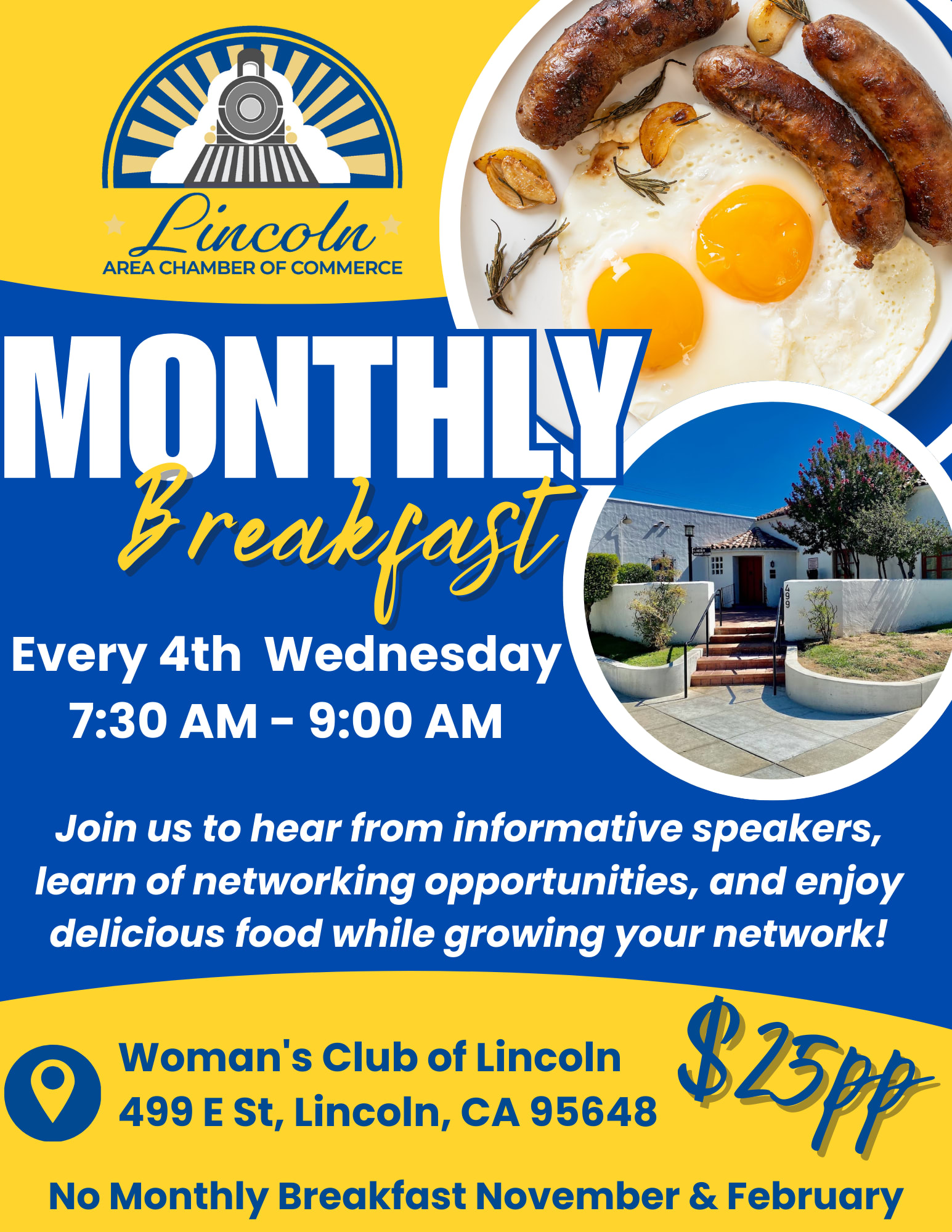 Our monthly breakfasts are held on the 4th Wednesday of each month from 7:30-9:00 am. Join us to hear from Informative Speakers, learn of Networking Opportunities, and enjoy delicious food while growing your network!