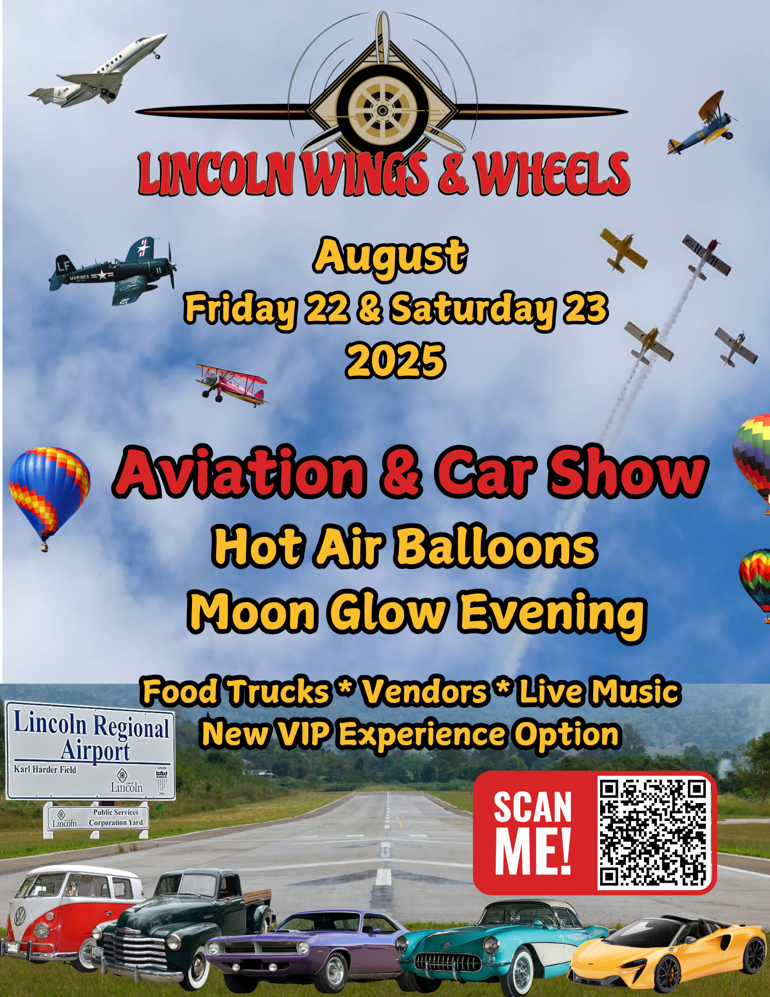 Thank you for considering financial support for the 2025 Lincoln Airport Wings & Wheels Community Expo. The Expo’s goal is to provide a fun, family-oriented, and educational experience for local and regional residents and visitors.